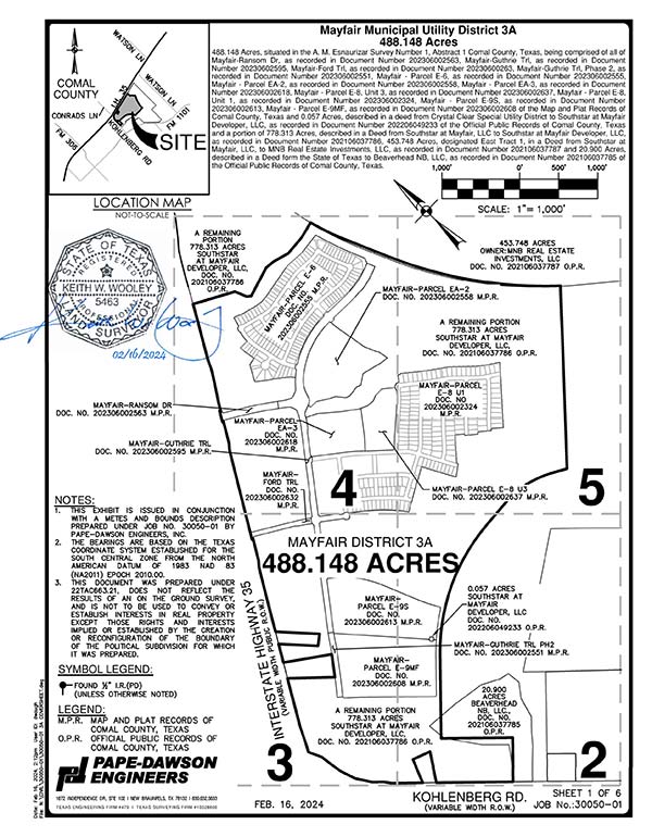 The Board of Directors held its organizational meeting on February 9, 2024. The District is located within the extra territorial jurisdiction of the City of New Braunfels, Texas. All water and wastewater facilities have been, or will be, conveyed to New Braunfels Utilities. All roads will be conveyed to Comal County. All detention and regional drainage facilities will be owned by Comal County Water Improvement District No. 3 Master District or The District.